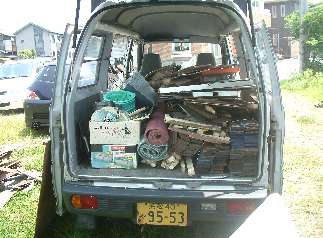 セットを壊した木材をキャンプファイヤー用の燃料として積み込む。
