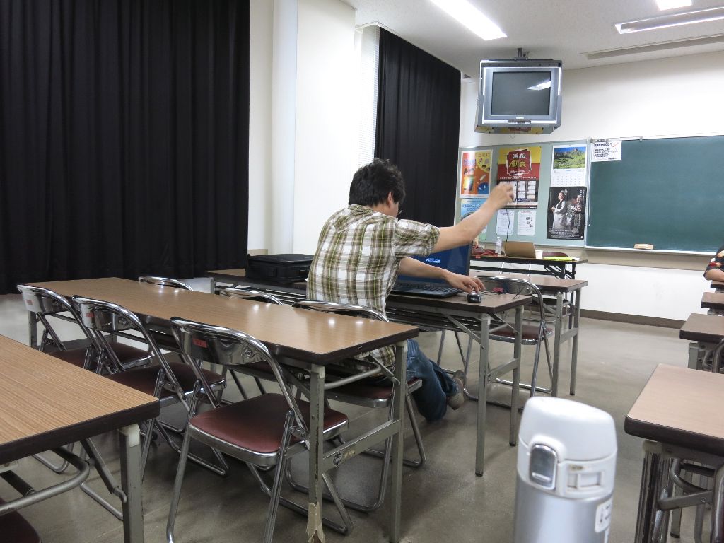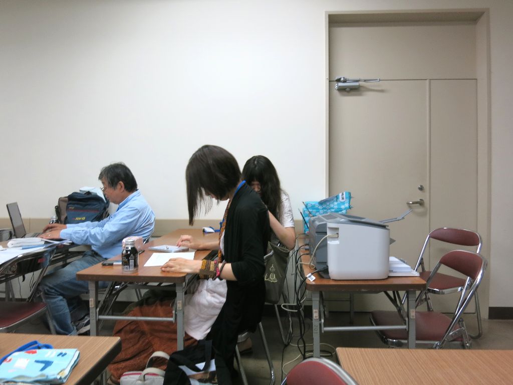 机を、部屋の照明回路に合わせ3分の1舞台に半分を机を寄せて発表会場を皆でつくりました。