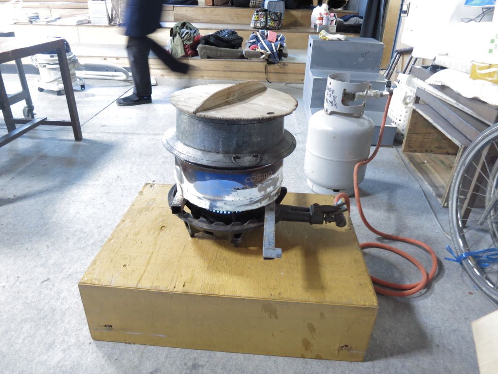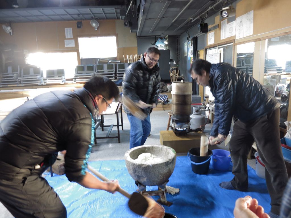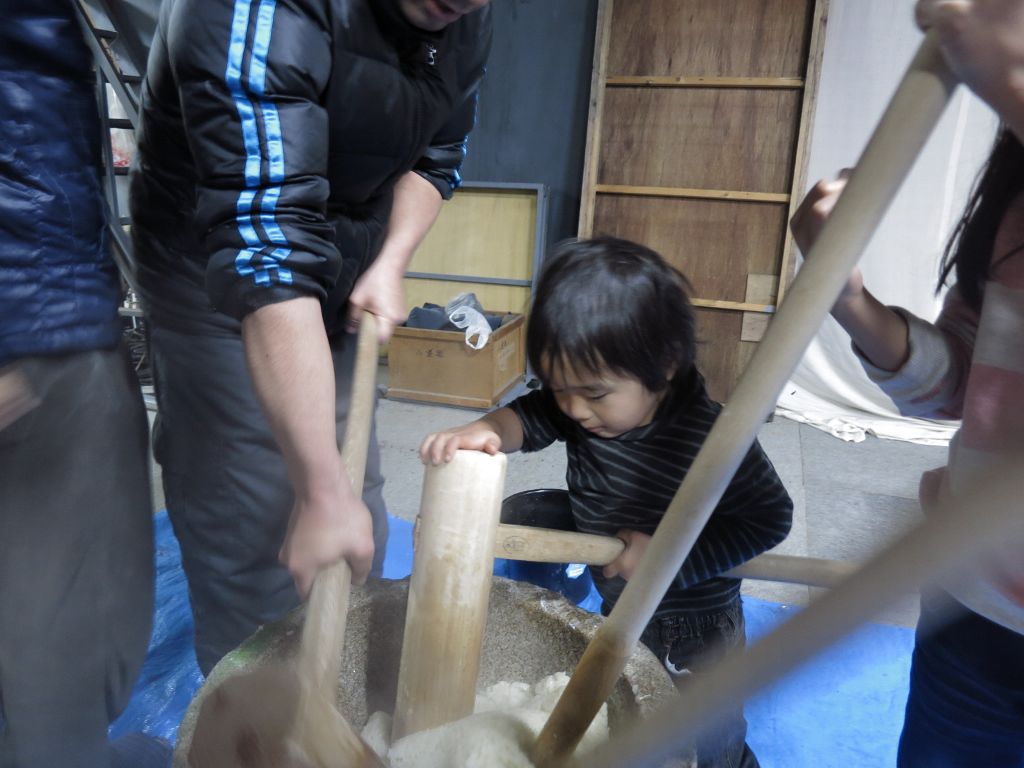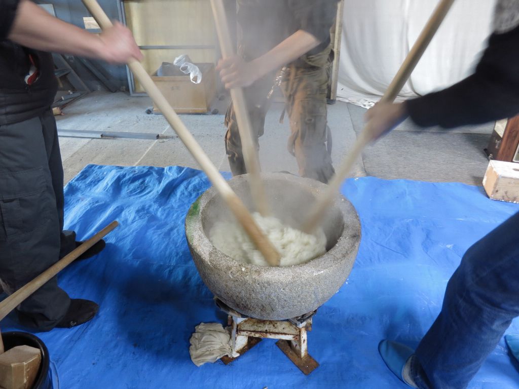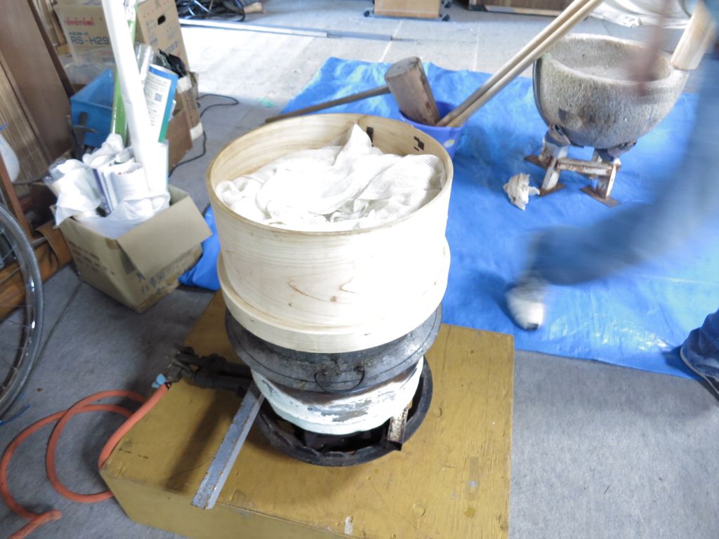 14:30プロパンコンロ着火。お湯をお釜で作る。石臼をお湯で温める。15:40:1臼目餅つきはじめる