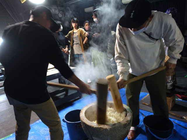 コナツキ作業は重労働、粒がないおいしいおもちにするに大事な作業。もち米が冷めないうちに、素早く行う。
