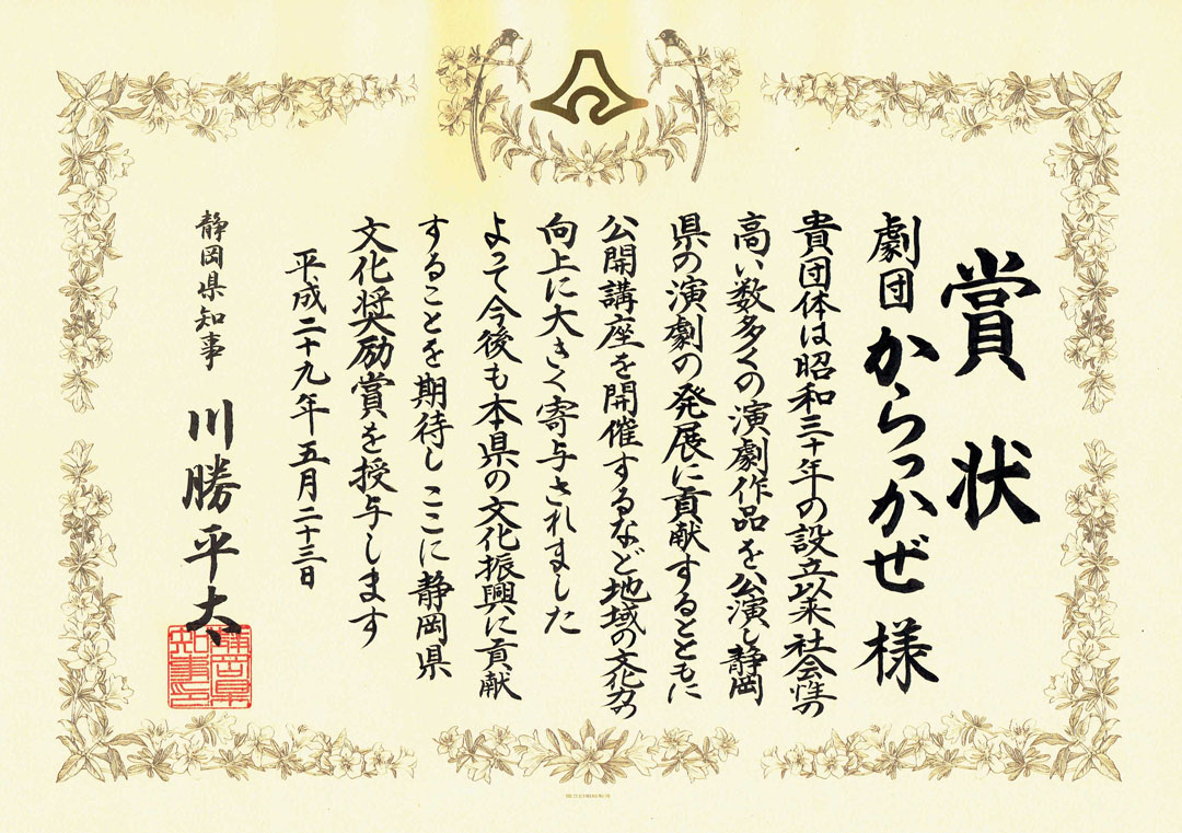 2017年 劇団からっかぜ2017年度静岡県文化奨励賞受賞