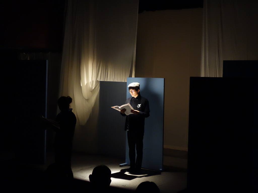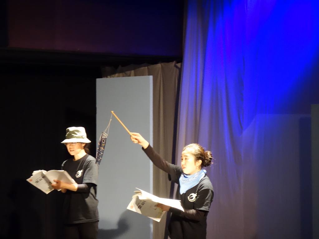 ○まず、いつもと違う形式の劇でドラマリーディングならではの演出があってとても新鮮でした。一人が2役、役者が目を合わせまい。道具がこいのぼりやカメラのみというシンプルさ。自分の心境や状況をセリフで聞けることでいつもの劇より自分が家で本を読むのを具現化しているような感覚を覚えていつもより入り込めた気がした。空は最初は夢しか見ていなかったのに、夢と現実の両方を知りながらも、夢で自分を想像しているように、空の気きばりや成長がが見えた。劇はノンフィクションというのか、またおもむきを感じた。